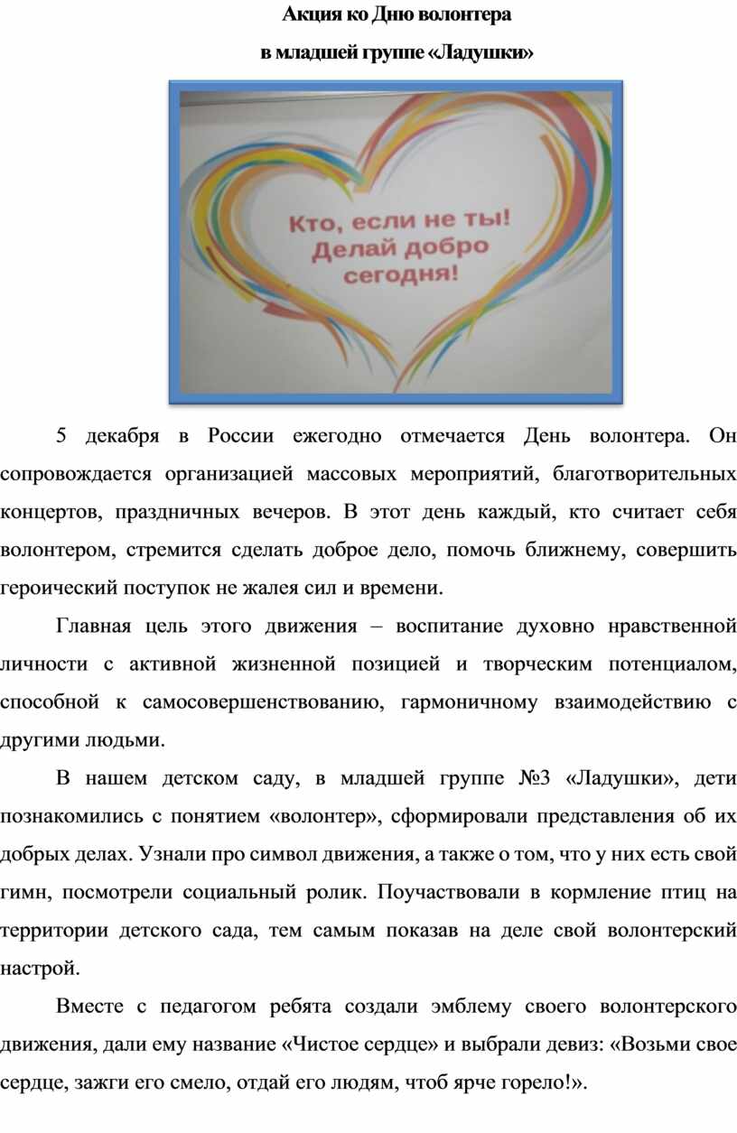 В нашем детском саду, в младшей группе №3 «Ладушки», дети познакомились с понятием «волонтер», сформировали представления об их добрых делах. Узнали про символ движения, а также о том, что у них есть свой гимн, посмотрели социальный ролик. Поучаствовали в кормление птиц на территории детского сада, тем самым показав на деле свой волонтерский настрой.