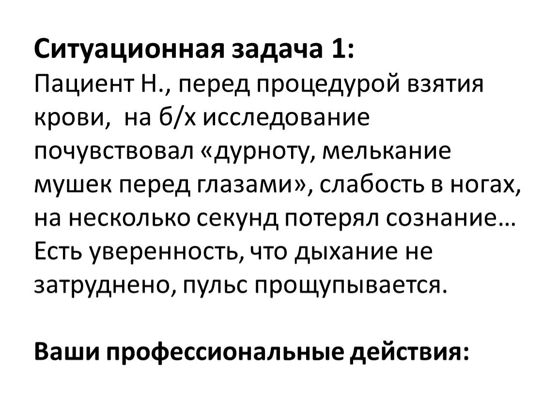 Ситуационная задача 1:Пациент Н., перед процедурой взятия крови, на б/х исследование почувствовал «дурноту, мелькание мушек перед глазами», слабость в ногах, на несколько секунд потерял сознание… Есть уверенность, что дыхание не затруднено, пульс прощупывается. Ваши профессиональные действия: