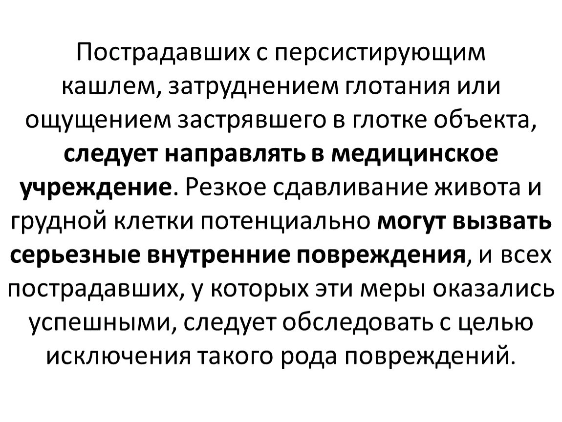 Пострадавших с персистирующимкашлем, затруднением глотания или ощущением застрявшего в глотке объекта, следует направлять в медицинское учреждение. Резкое сдавливание живота и грудной клетки потенциально могут вызвать серьезные внутренние повреждения, и всех пострадавших, у которых эти меры оказалисьуспешными, следует обследовать с целью исключения такого рода повреждений.