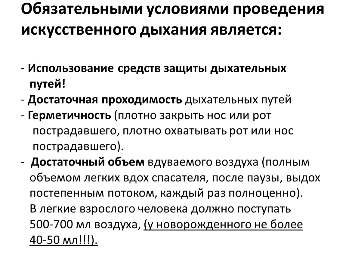 Обязательными условиями проведения искусственного дыхания является:- Использование средств защиты дыхательных путей! - Достаточная проходимость дыхательных путей- Герметичность (плотно закрыть нос или рот пострадавшего, плотно охватывать рот или нос пострадавшего).- Достаточный объем вдуваемого воздуха (полным объемом легких вдох спасателя, после паузы, выдох постепенным потоком, каждый раз полноценно). В легкие взрослого человека должно поступать 500-700 мл воздуха, (у новорожденного не более 40-50 мл!!!).