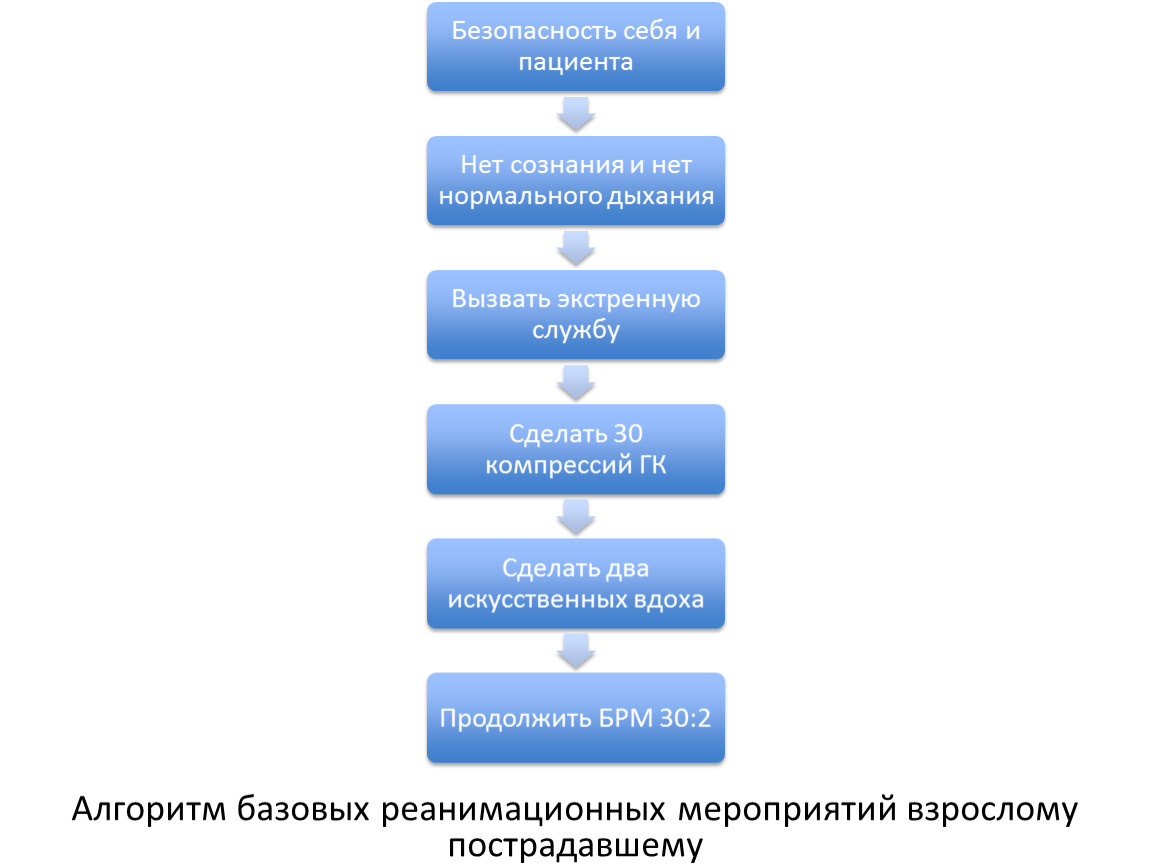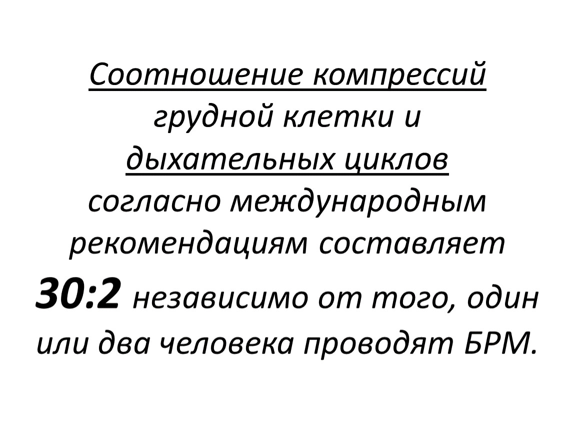 Соотношение компрессий грудной клетки и дыхательных циклов согласно международным рекомендациям составляет 30:2 независимо от того, один или два человека проводят БРМ.
