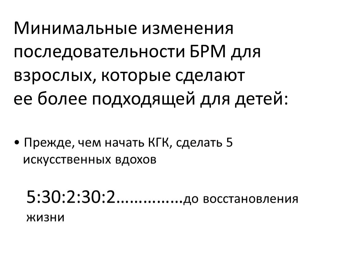 Минимальные изменения последовательности БРМ для взрослых, которые сделаютее более подходящей для детей:• Прежде, чем начать КГК, сделать 5 искусственных вдохов 5:30:2:30:2……………до восстановления жизни