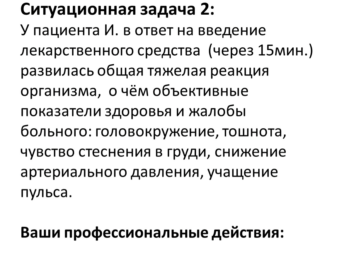 Ситуационная задача 2:У пациента И. в ответ на введение лекарственного средства (через 15мин.) развилась общая тяжелая реакция организма, о чём объективные показатели здоровья и жалобы больного: головокружение, тошнота, чувство стеснения в груди, снижение артериального давления, учащение пульса.Ваши профессиональные действия: