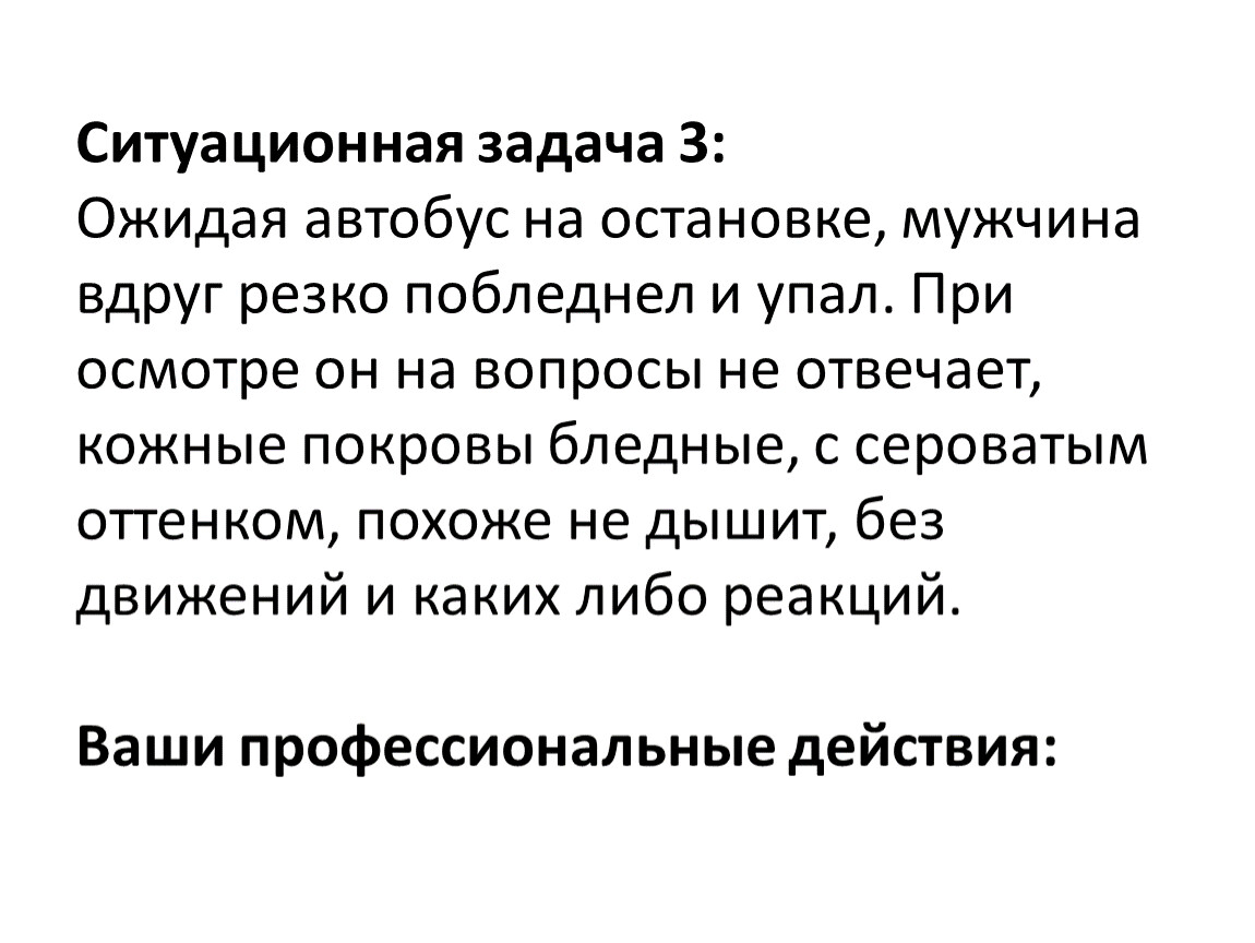 Ситуационная задача 3:Ожидая автобус на остановке, мужчина вдруг резко побледнел и упал. При осмотре он на вопросы не отвечает, кожные покровы бледные, с сероватым оттенком, похоже не дышит, без движений и каких либо реакций. Ваши профессиональные действия: