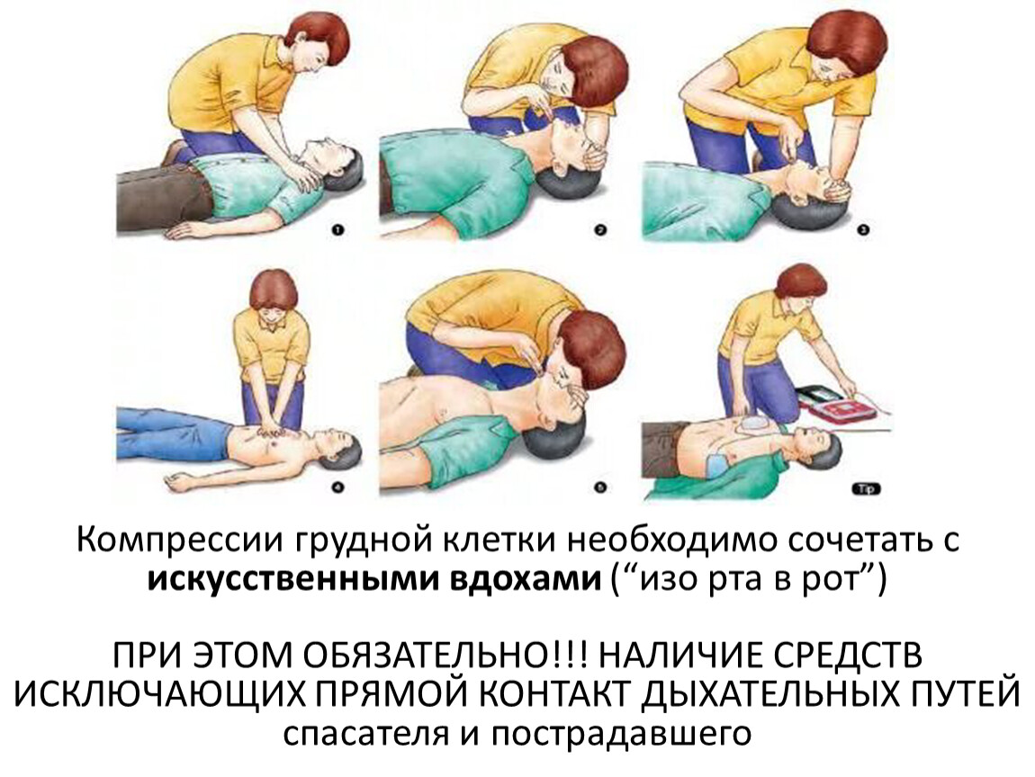 ПРИ ЭТОМ ОБЯЗАТЕЛЬНО!!! НАЛИЧИЕ СРЕДСТВ ИСКЛЮЧАЮЩИХ ПРЯМОЙ КОНТАКТ ДЫХАТЕЛЬНЫХ ПУТЕЙ спасателя и пострадавшего