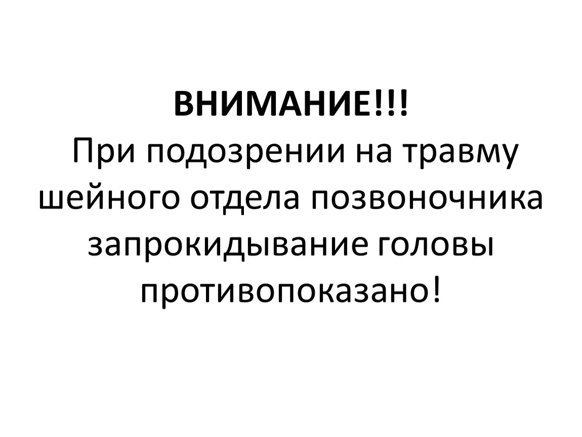 ВНИМАНИЕ!!! При подозрении на травму шейного отдела позвоночника запрокидывание головы противопоказано!