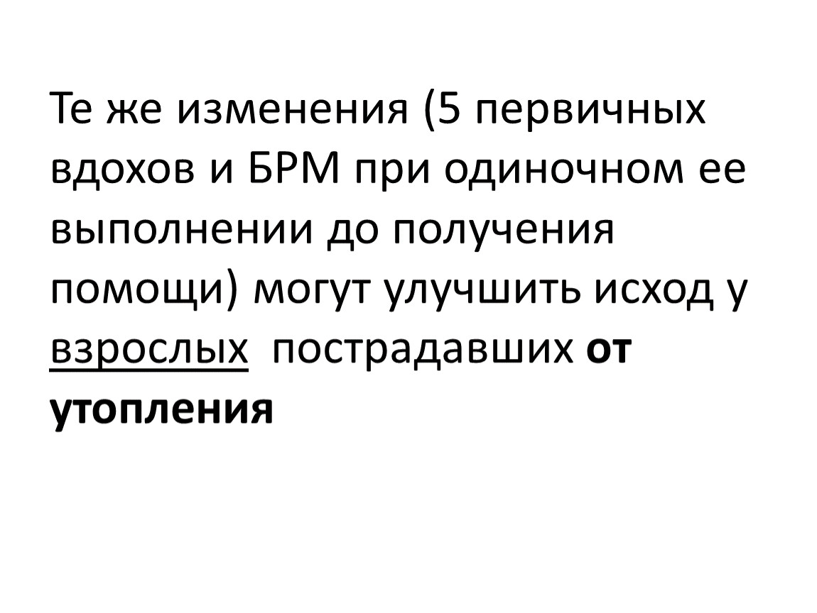 Те же изменения (5 первичныхвдохов и БРМ при одиночном еевыполнении до получения помощи) могут улучшить исход у взрослых пострадавших отутопления