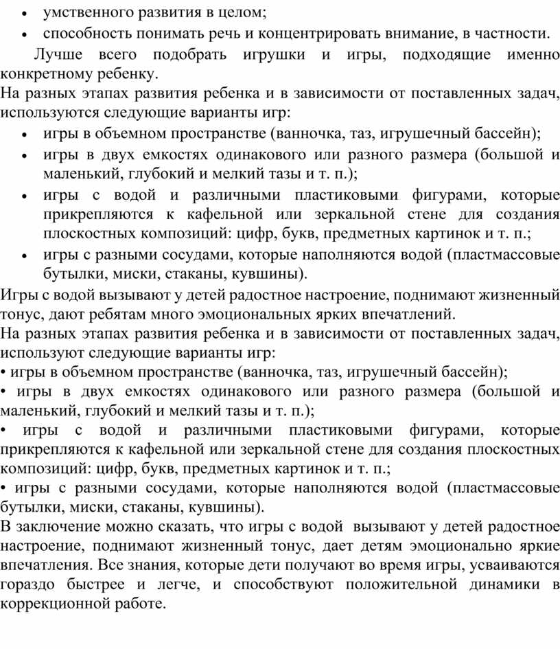В заключение можно сказать, что игры с водой вызывают у детей радостное настроение, поднимают жизненный тонус, дает детям эмоционально яркие впечатления. Все знания, которые дети получают во время игры, усваиваются гораздо быстрее и легче, и способствуют положительной динамики в коррекционной работе.
