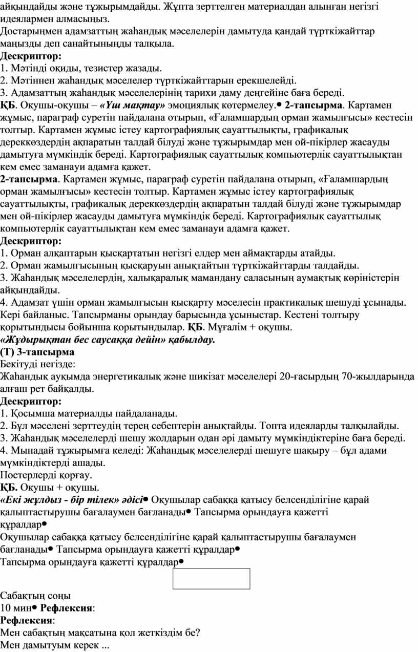 2-тапсырма. Картамен жұмыс, параграф суретін пайдалана отырып, «Ғаламшардың орман жамылғысы» кестесін толтыр. Картамен жұмыс істеу картографиялық сауаттылықты, графикалық дереккөздердің ақпаратын талдай білуді және тұжырымдар мен ой-пікірлер жасауды дамытуға мүмкіндік береді. Картографиялық сауаттылық компьютерлік сауаттылықтан кем емес заманауи адамға қажет. Дескриптор: 1. Орман алқаптарын қысқартатын негізгі елдер мен аймақтарды атайды. 2. Орман жамылғысының қысқаруын анықтайтын түрткіжайттарды талдайды. 3. Жаһандық мәселелердің, халықаралық мамандану саласының аумақтық көріністерін айқындайды. 4. Адамзат үшін орман жамылғысын қысқарту мәселесін практикалық шешуді ұсынады. Кері байланыс. Тапсырманы орындау барысында ұсыныстар. Кестені толтыру қорытындысы бойынша қорытындылар. ҚБ. Мұғалім + оқушы. «Жұдырықтан бес саусаққа дейін» қабылдау. (Т) 3-тапсырма Бекітуді негізде: Жаһандық ауқымда энергетикалық және шикізат мәселелері 20-ғасырдың 70-жылдарында алғаш рет байқалды. Дескриптор: 1. Қосымша материалды пайдаланады. 2. Бұл мәселені зерттеудің терең себептерін анықтайды. Топта идеяларды талқылайды. 3. Жаһандық мәселелерді шешу жолдарын одан әрі дамыту мүмкіндіктеріне баға береді. 4. Мынадай тұжырымға келеді: Жаһандық мәселелерді шешуге шақыру – бұл адами мүмкіндіктерді ашады. Постерлерді қорғау. ҚБ. Оқушы + оқушы. «Екі жұлдыз - бір тілек» әдісі |