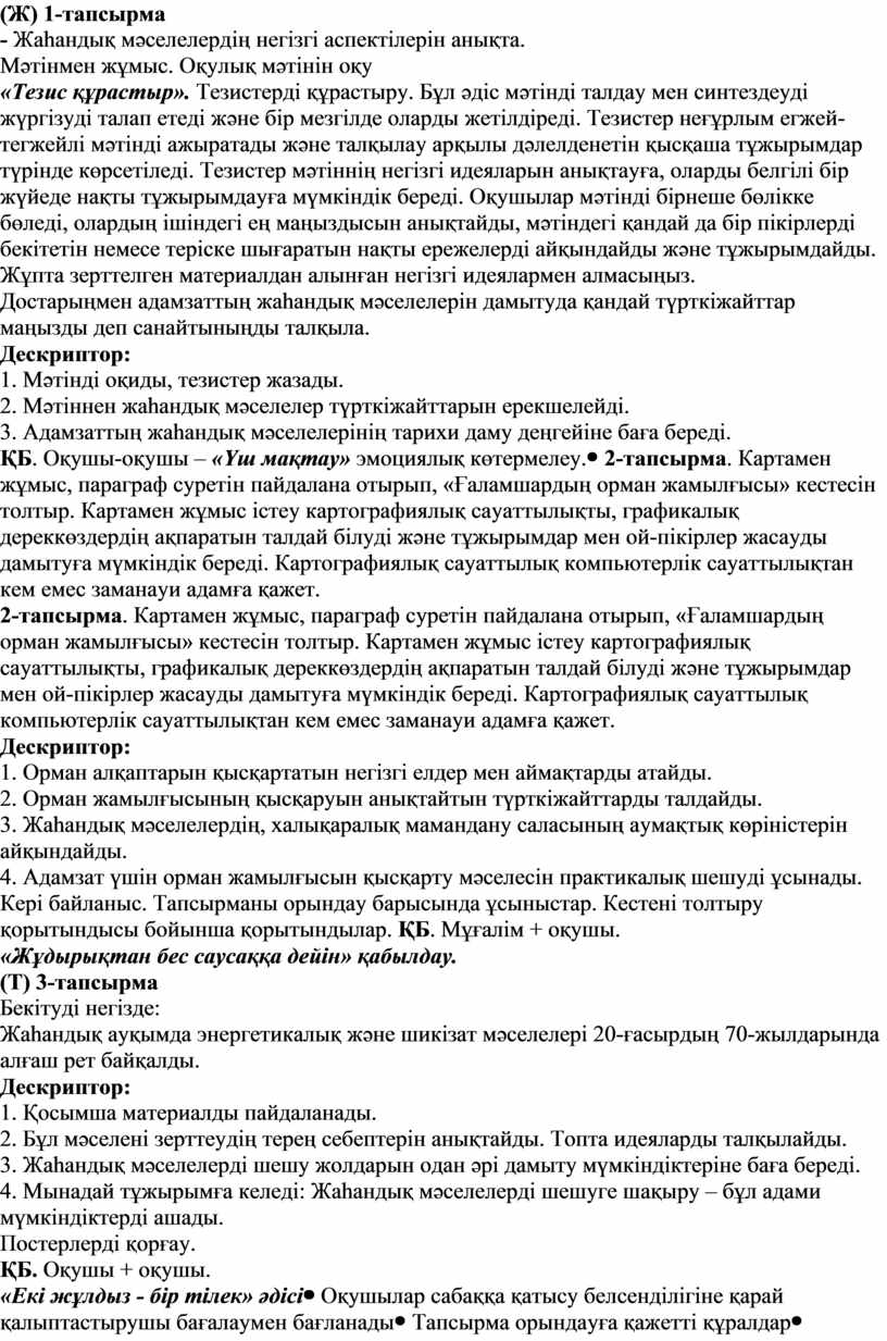 - Адамзат дамуындағы жаһандық мәселелердің критерийлерін біледі және анықтайды, - Жаһандық мәселелердіңсебептері мен салдарын талдайды; - Жаһандық мәселелердің аумақтық көріну дәрежесіне баға береді. |