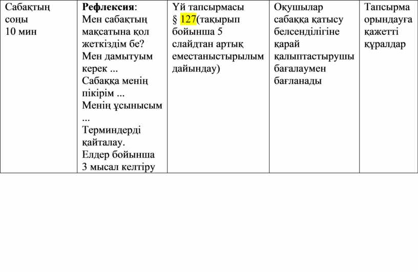 Рефлексия: Мен сабақтың мақсатына қол жеткіздім бе? Мен дамытуым керек ... Сабаққа менің пікірім ... Менің ұсынысым ... Терминдерді қайталау. Елдер бойынша 3 мысал келтіру |