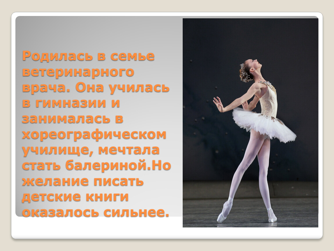 Родилась в семье ветеринарного врача. Она училась в гимназии и занималась в хореографическом училище, мечтала стать балериной.Но желание писать детские книги оказалось сильнее.