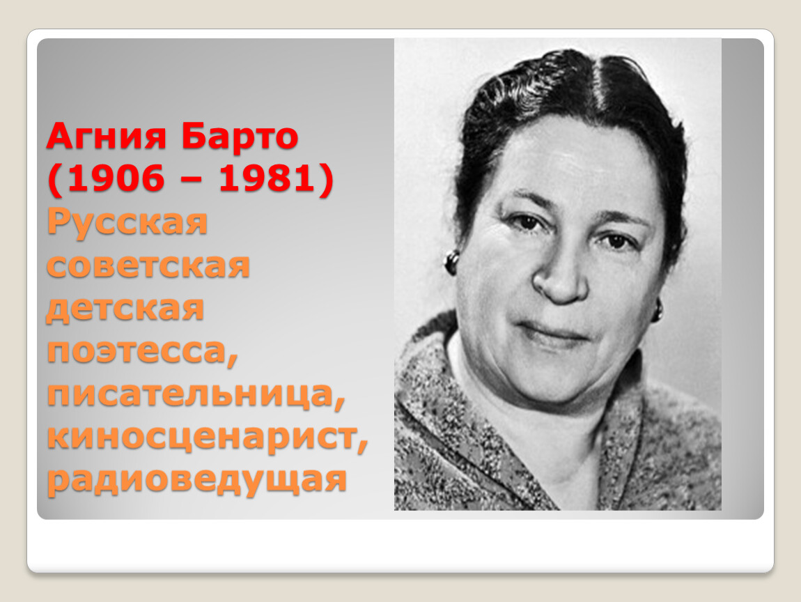 Агния Барто (1906 – 1981)Русская советская детская поэтесса, писательница, киносценарист, радиоведущая