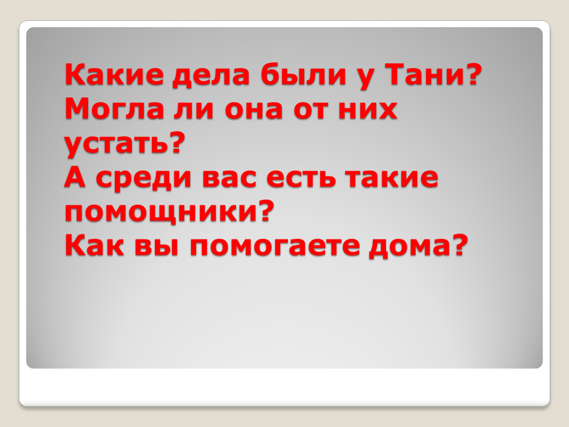 Какие дела были у Тани?Могла ли она от них устать?А среди вас есть такие помощники?Как вы помогаете дома?