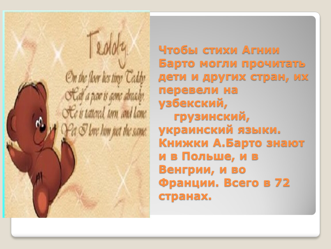 Чтобы стихи Агнии Барто могли прочитать дети и других стран, их перевели на узбекский, грузинский, украинский языки. Книжки А.Барто знают и в Польше, и в Венгрии, и во Франции. Всего в 72 странах.