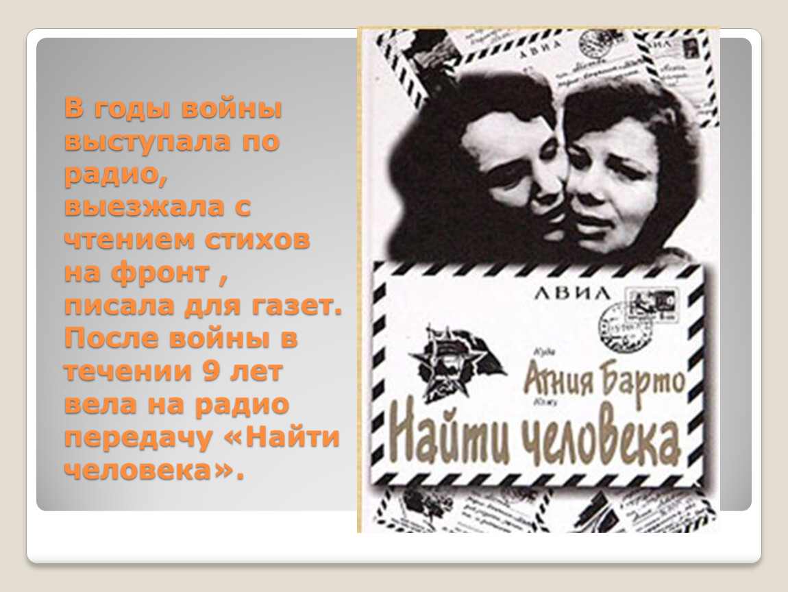 В годы войны выступала по радио,выезжала с чтением стихов на фронт , писала для газет.После войны в течении 9 лет вела на радио передачу «Найти человека».