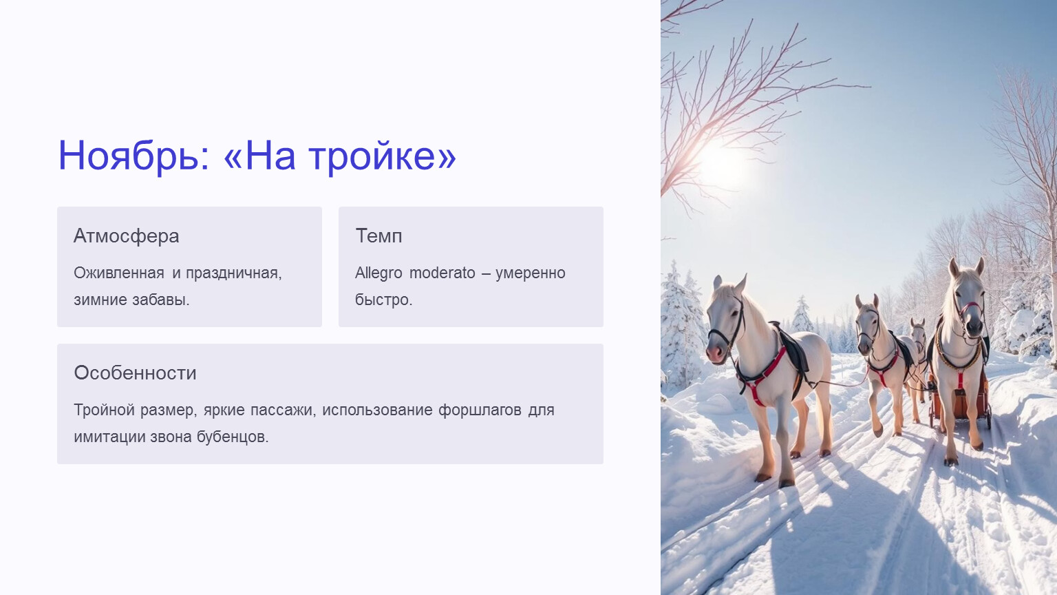 Тройной размер, яркие пассажи, использование форшлагов для имитации звона бубенцов.