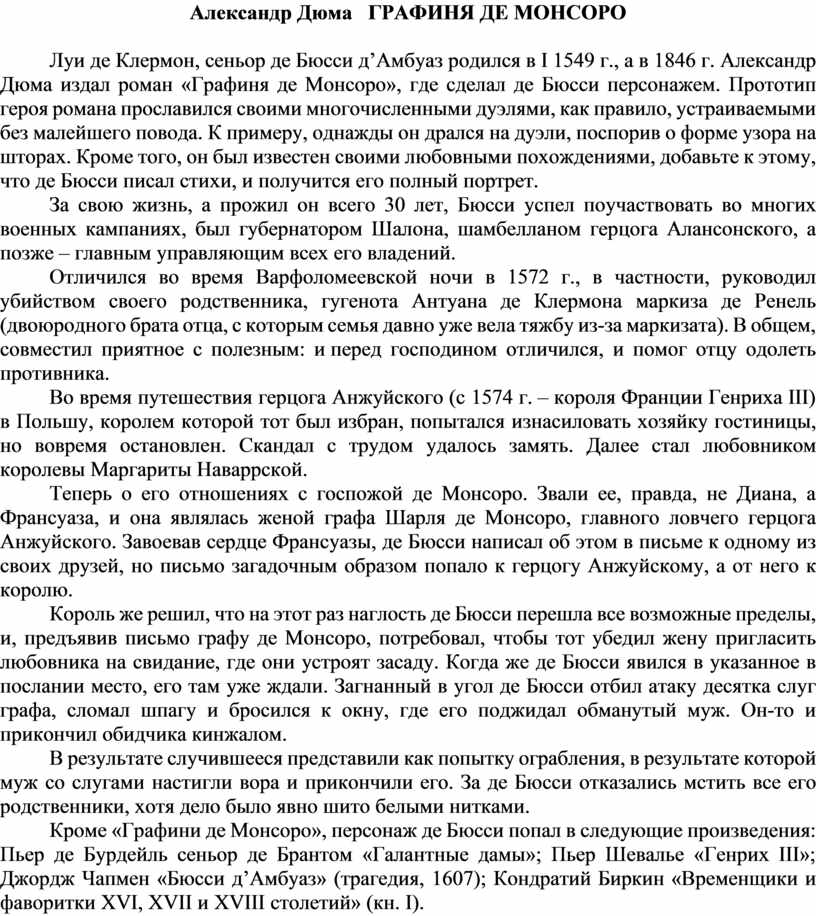 Луи де Клермон, сеньор де Бюсси д’Амбуаз родился в I 1549 г., а в 1846 г. Александр Дюма издал роман «Графиня де Монсоро», где сделал де Бюсси персонажем. Прототип героя романа прославился своими многочисленными дуэлями, как правило, устраиваемыми без малейшего повода. К примеру, однажды он дрался на дуэли, поспорив о форме узора на шторах. Кроме того, он был известен своими любовными похождениями, добавьте к этому, что де Бюсси писал стихи, и получится его полный портрет.