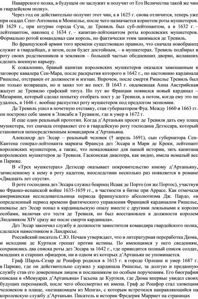 И еще один реальный прототип. Когда д’Артаньян просит де Тревиля дать ему плащ мушкетера, тот сначала отправляет его в гвардейскую роту господина Дезэссара, который становится непосредственным командиром д’Артаньяна.