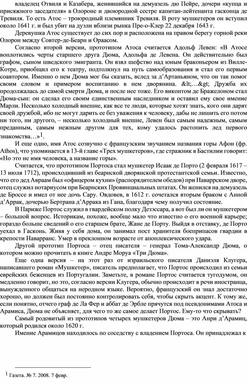 Теперь о друзьях д’Артаньяна. Так получилось, что Дюма, взяв имена из имеющихся мемуаров, ничего не узнал об этих людях и даже, возможно, предполагал, что таковых никогда не существовало. К примеру, в литературном еженедельнике «La Pays Natal» в 1864 г. Дюма написал: «Меня спрашивают, когда именно жил Анж Питу… Это вынуждает меня сказать, что Анж Питу, так же как и Монте-Кристо, так же как Атос, Портос и Арамис, никогда не существовал. Все они просто признанные публикой побочные дети моего воображения».