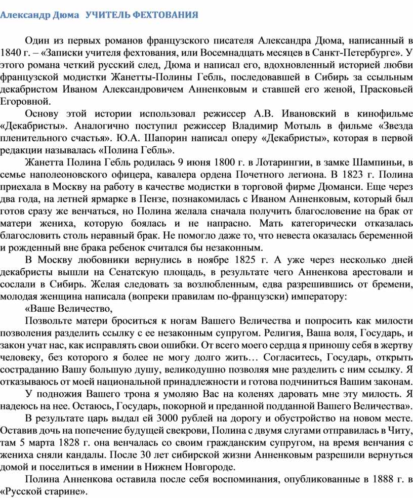 Один из первых романов французского писателя Александра Дюма, написанный в 1840 г. – «Записки учителя фехтования, или Восемнадцать месяцев в Санкт-Петербурге». У этого романа четкий русский след, Дюма и написал его, вдохновленный историей любви французской модистки Жанетты-Полины Гебль, последовавшей в Сибирь за ссыльным декабристом Иваном Александровичем Анненковым и ставшей его женой, Прасковьей Егоровной.