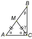 Решение: ÐА+ÐВ+ÐС=180°, a + b + 90=180°, a + g =90°. Следовательно b = g. Треугольник ВСМ – равнобедренный.