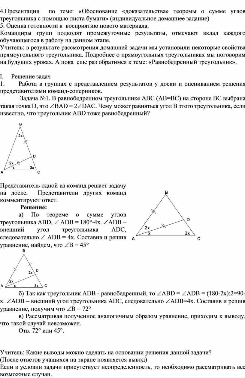 4.Презентация по теме: «Обоснование «доказательства» теоремы о сумме углов треугольника с помощью листа бумаги» (индивидуальное домашнее задание)