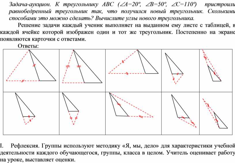 Задача-аукцион. К треугольнику АВС (ÐА=20º, ÐВ=50º, ÐС=110º) пристроили равнобедренный треугольник так, что получился новый треугольник. Сколькими способами это можно сделать? Вычислите углы нового треугольника.