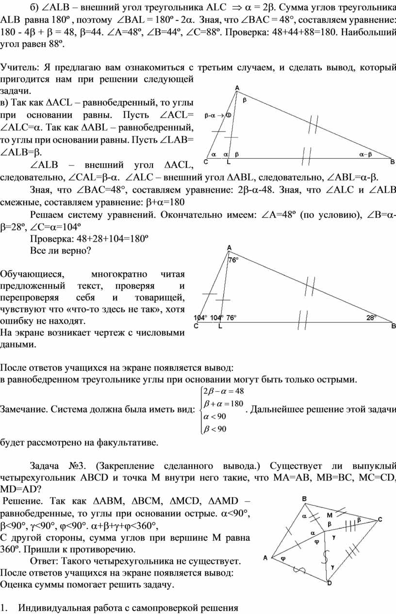 б) ÐALB – внешний угол треугольника ALC Þ a = 2b. Сумма углов треугольника ALB равна 180º , поэтому ÐВАL = 180º - 2a. Зная, что ÐВАС = 48°, составляем уравнение: 180 - 4b + b = 48, b=44. ÐА=48º, ÐВ=44º, ÐС=88º. Проверка: 48+44+88=180. Наибольший угол равен 88º.