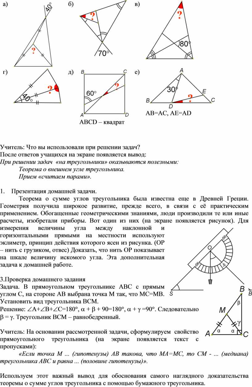 Учитель: в результате рассмотрения домашней задачи мы установили некоторые свойства прямоугольного треугольника. Подробнее о прямоугольных треугольниках мы поговорим на будущих уроках. А пока еще раз обратимся к теме: «Равнобедренный треугольник».