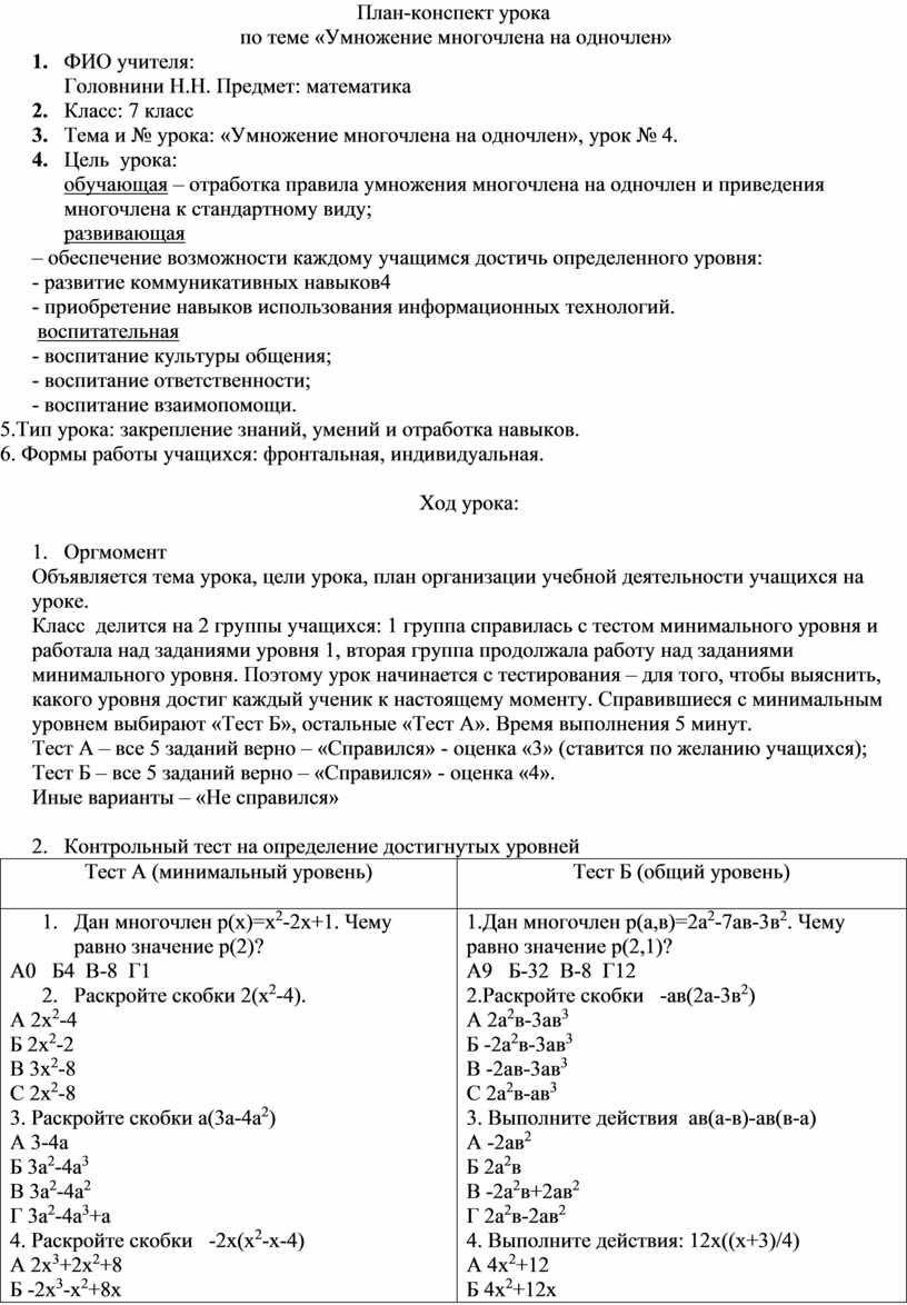 3. Тема и № урока: «Умножение многочлена на одночлен», урок № 4.