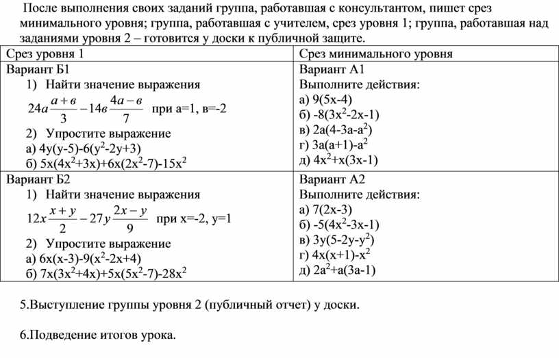 После выполнения своих заданий группа, работавшая с консультантом, пишет срез минимального уровня; группа, работавшая с учителем, срез уровня 1; группа, работавшая над заданиями уровня 2 – готовится у доски к публичной защите.