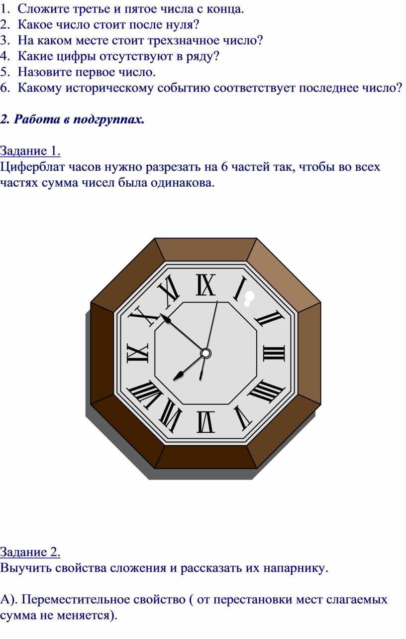 Циферблат часов нужно разрезать на 6 частей так, чтобы во всех частях сумма чисел была одинакова.