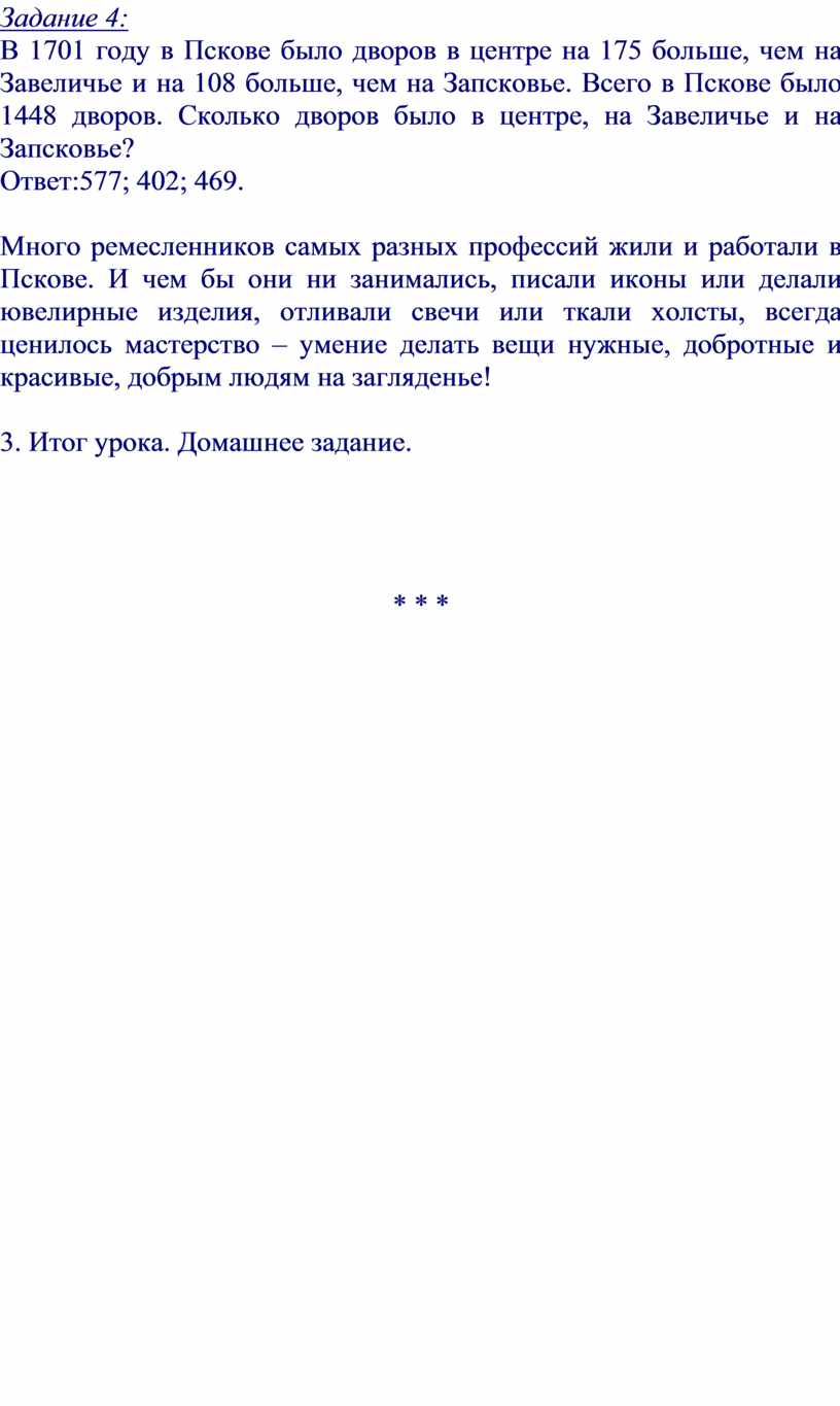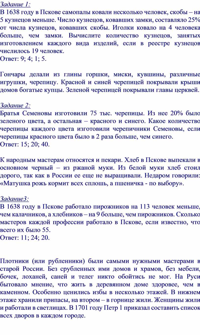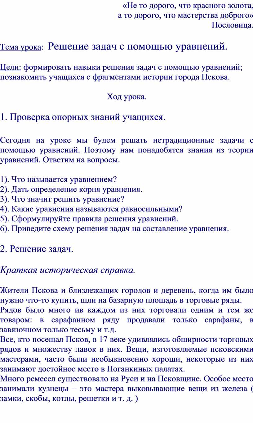 Цели: формировать навыки решения задач с помощью уравнений; познакомить учащихся с фрагментами истории города Пскова.