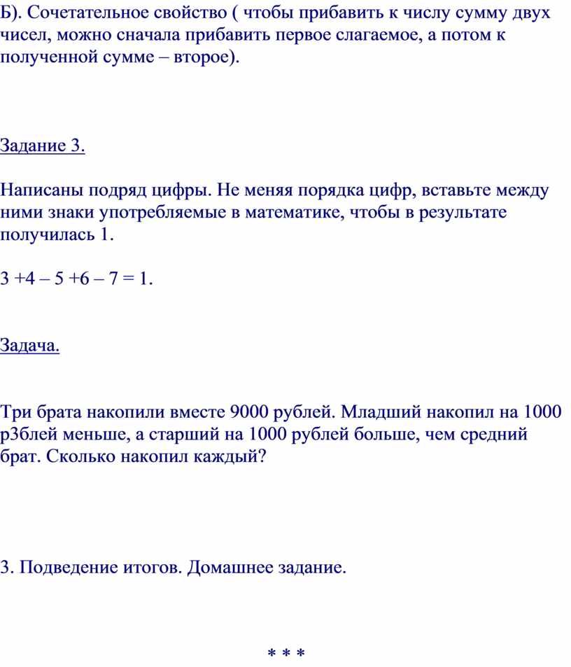 Б). Сочетательное свойство ( чтобы прибавить к числу сумму двух чисел, можно сначала прибавить первое слагаемое, а потом к полученной сумме – второе).