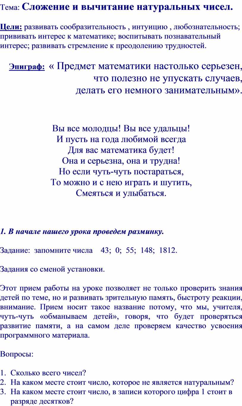 Тема: Сложение и вычитание натуральных чисел.
