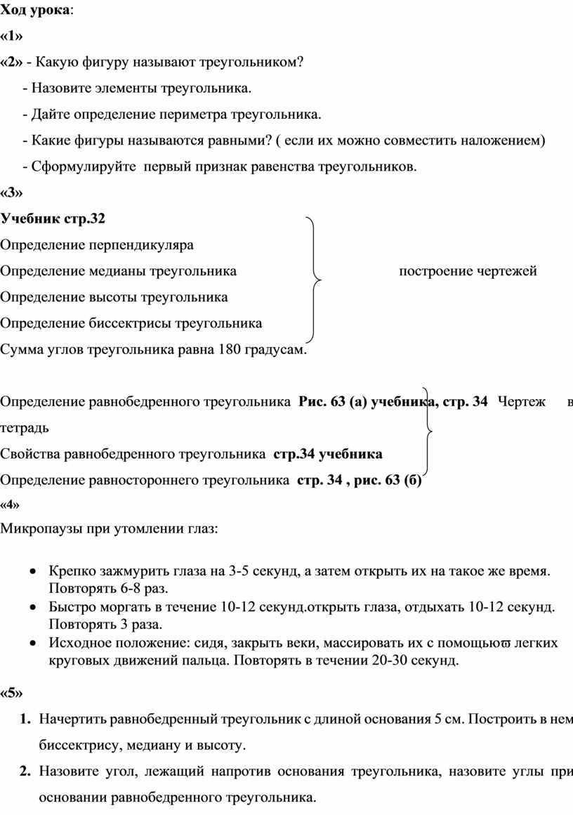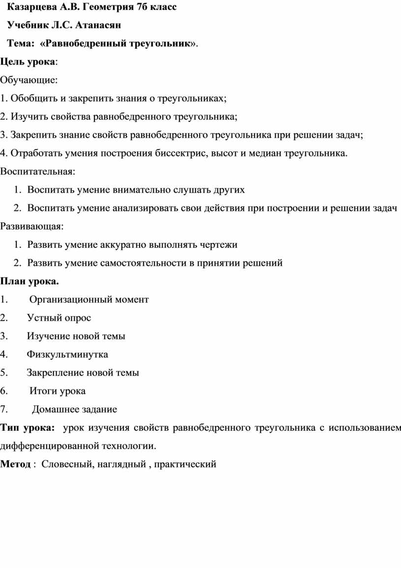 Тип урока: урок изучения свойств равнобедренного треугольника с использованием дифференцированной технологии.
