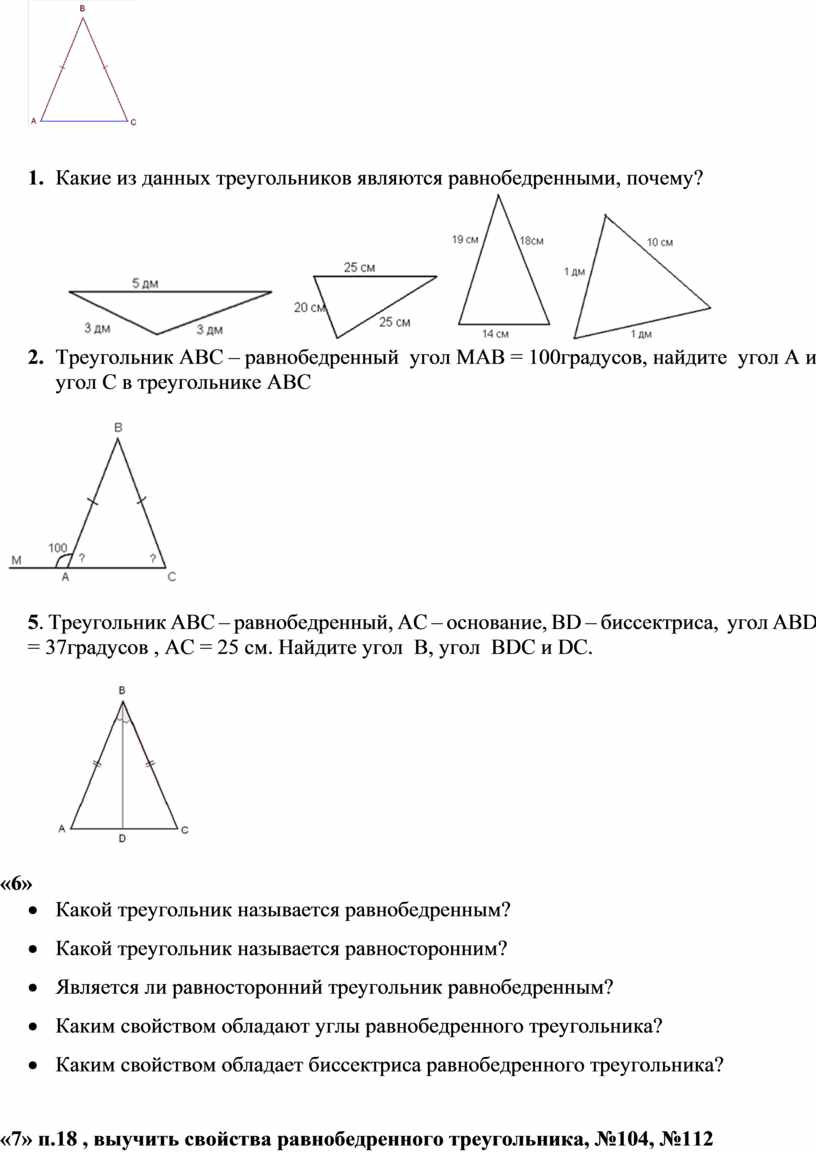 «7» п.18 , выучить свойства равнобедренного треугольника, №104, №112