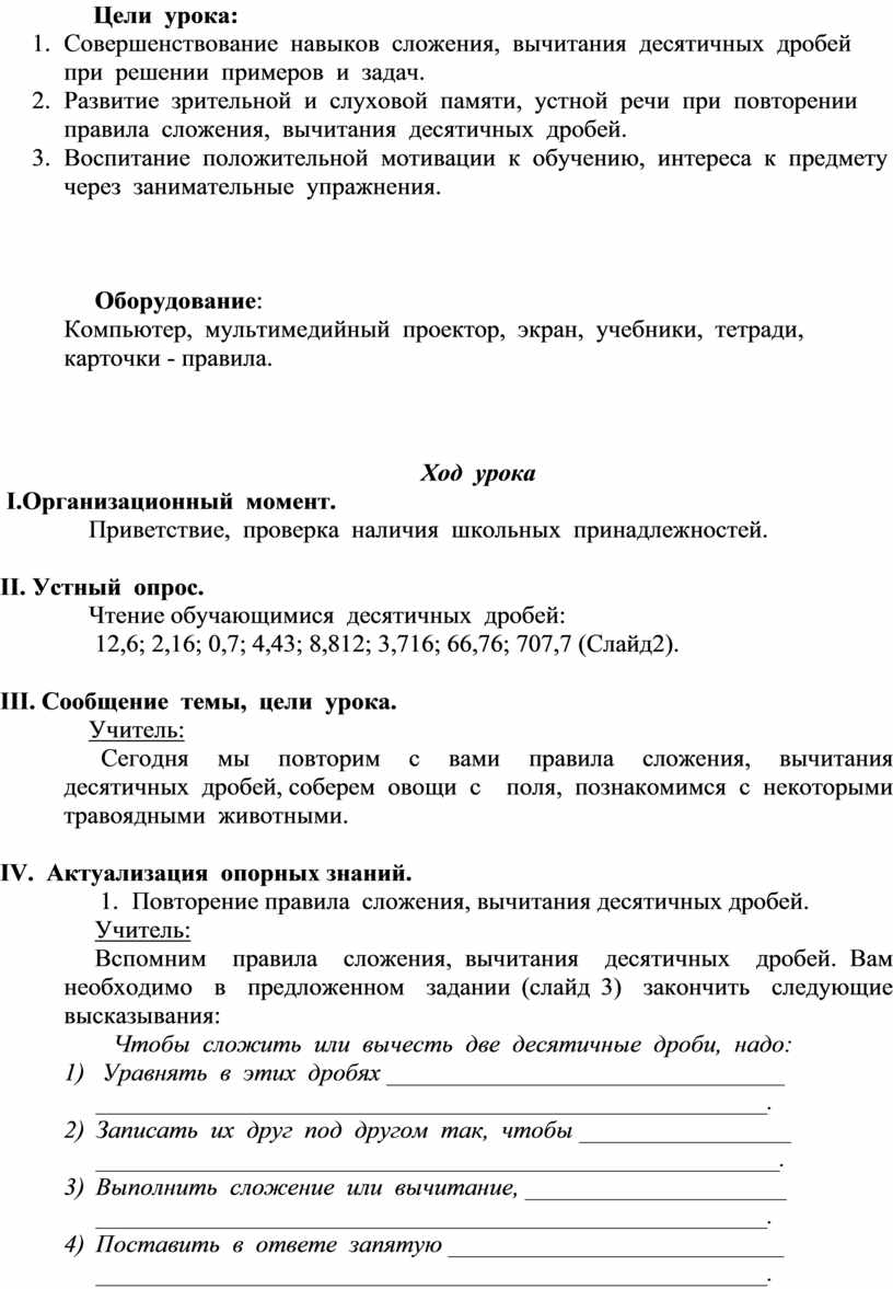 Сегодня мы повторим с вами правила сложения, вычитания десятичных дробей, соберем овощи с поля, познакомимся с некоторыми травоядными животными.