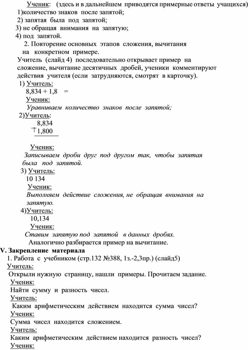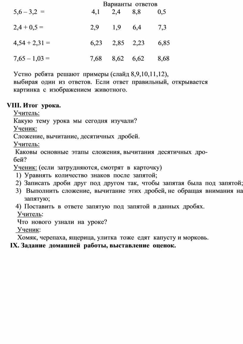 сложение, вычитание десятичных дробей, ученики комментируют