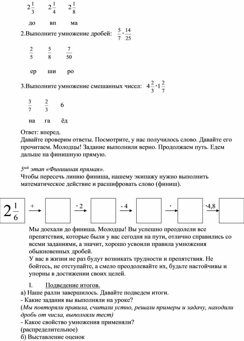Мы доехали до финиша. Молодцы! Вы успешно преодолели все препятствия, которые были у вас сегодня на пути, отлично справились со всеми заданиями, а значит, хорошо усвоили правила умножения обыкновенных дробей.