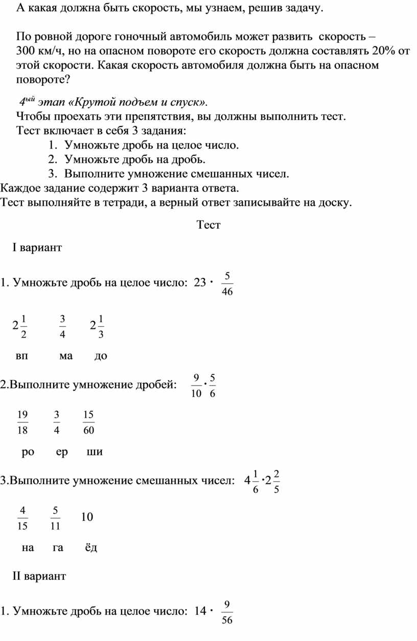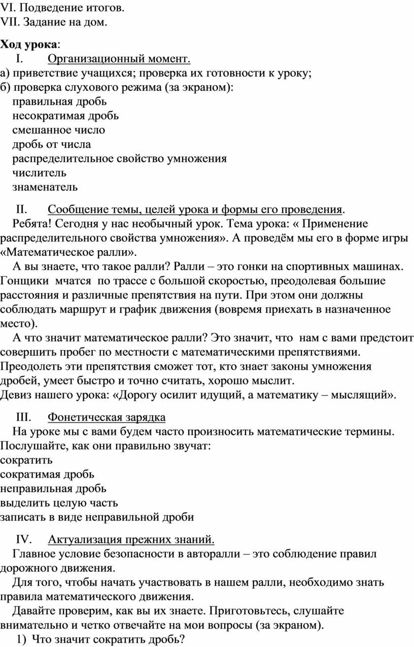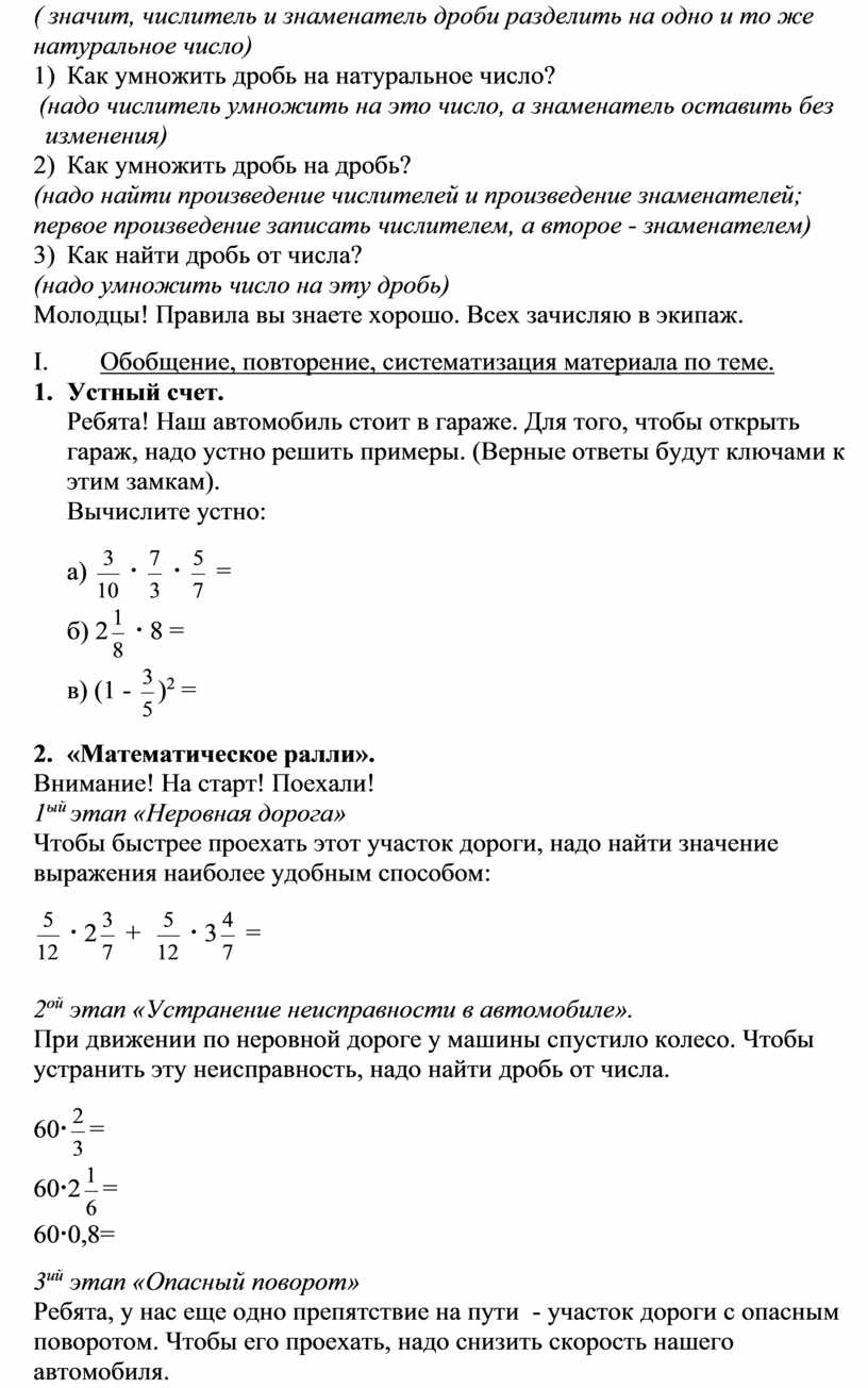 А что значит математическое ралли? Это значит, что нам с вами предстоит совершить пробег по местности с математическими препятствиями. Преодолеть эти препятствия сможет тот, кто знает законы умножения дробей, умеет быстро и точно считать, хорошо мыслит.