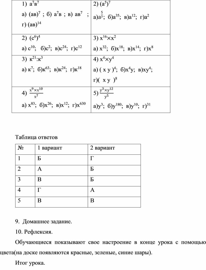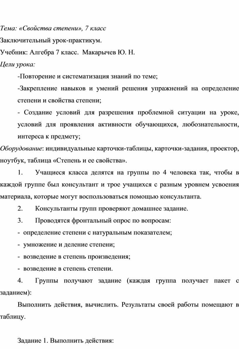 Тема: «Свойства степени», 7 класс