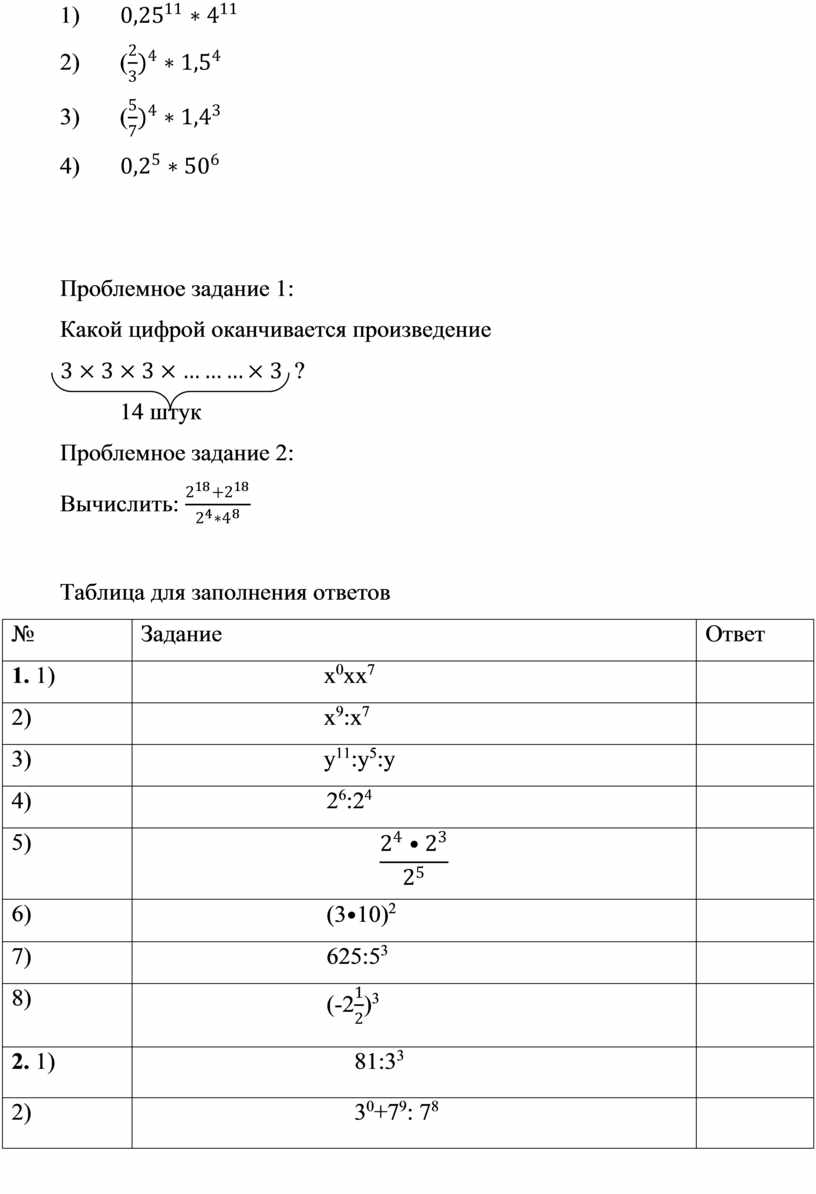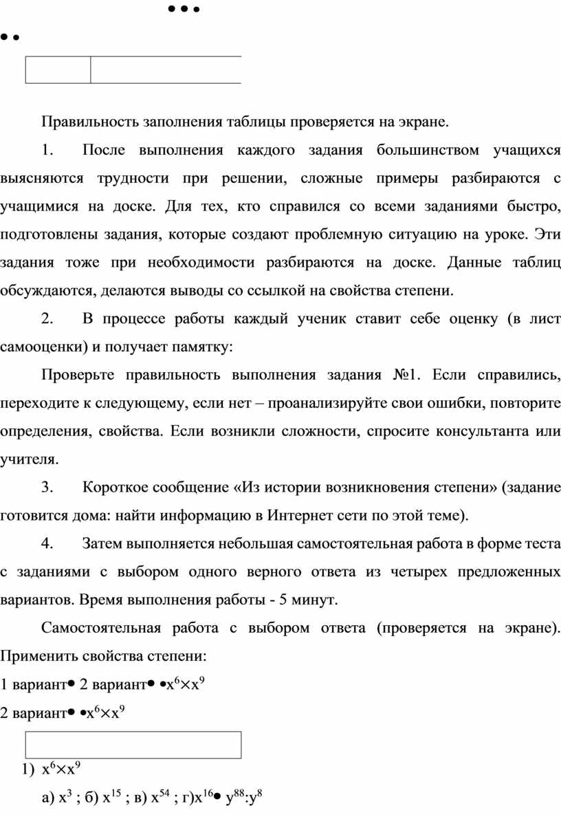 5. После выполнения каждого задания большинством учащихся выясняются трудности при решении, сложные примеры разбираются с учащимися на доске. Для тех, кто справился со всеми заданиями быстро, подготовлены задания, которые создают проблемную ситуацию на уроке. Эти задания тоже при необходимости разбираются на доске. Данные таблиц обсуждаются, делаются выводы со ссылкой на свойства степени.