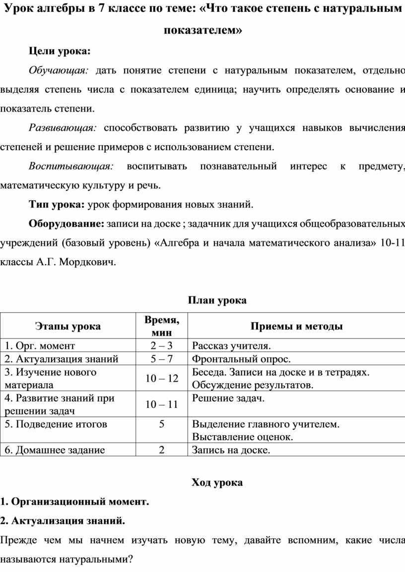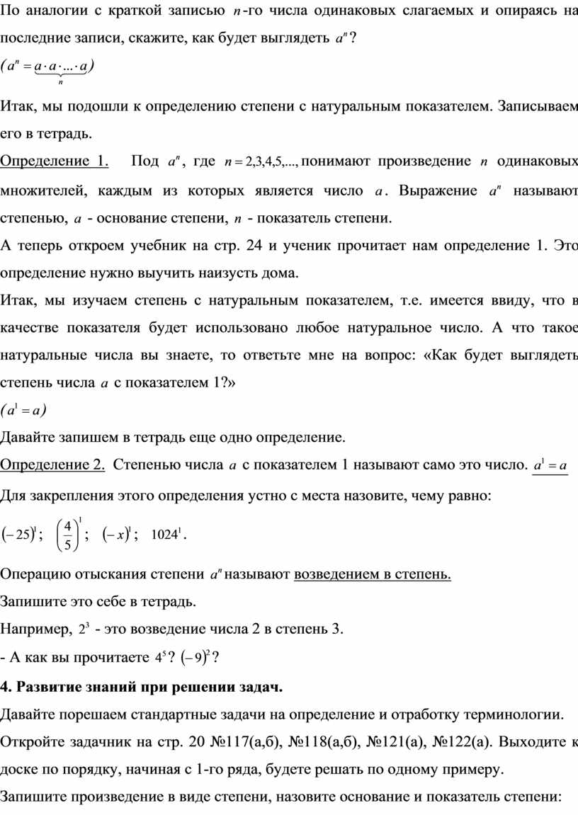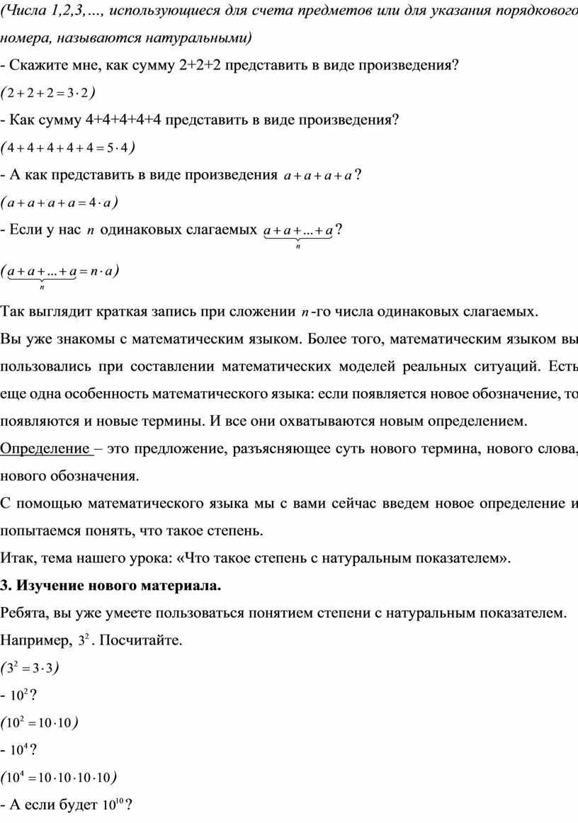 Урок алгебры в 7 классе по теме: «Что такое степень с натуральным показателем»