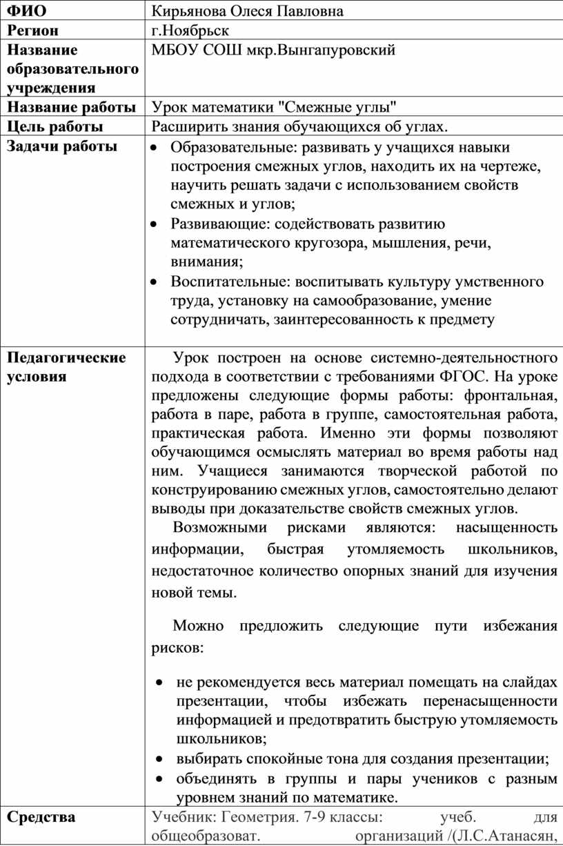 Урок построен на основе системно-деятельностного подхода в соответствии с требованиями ФГОС. На уроке предложены следующие формы работы: фронтальная, работа в паре, работа в группе, самостоятельная работа, практическая работа. Именно эти формы позволяют обучающимся осмыслять материал во время работы над ним. Учащиеся занимаются творческой работой по конструированию смежных углов, самостоятельно делают выводы при доказательстве свойств смежных углов. Возможными рисками являются: насыщенность информации, быстрая утомляемость школьников, недостаточное количество опорных знаний для изучения новой темы. Можно предложить следующие пути избежания рисков: · не рекомендуется весь материал помещать на слайдах презентации, чтобы избежать перенасыщенности информацией и предотвратить быструю утомляемость школьников; · выбирать спокойные тона для создания презентации; · объединять в группы и пары учеников с разным уровнем знаний по математике. |