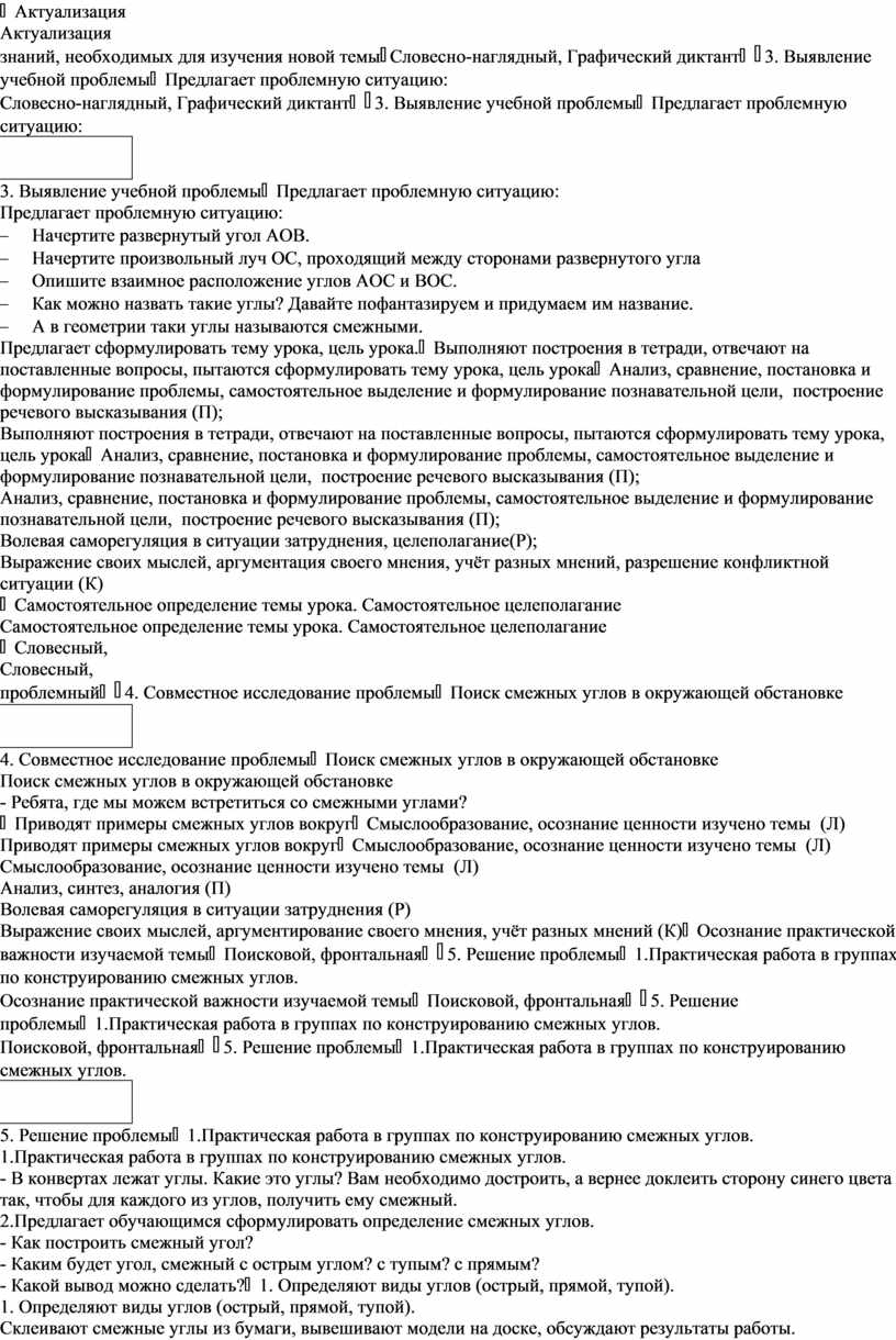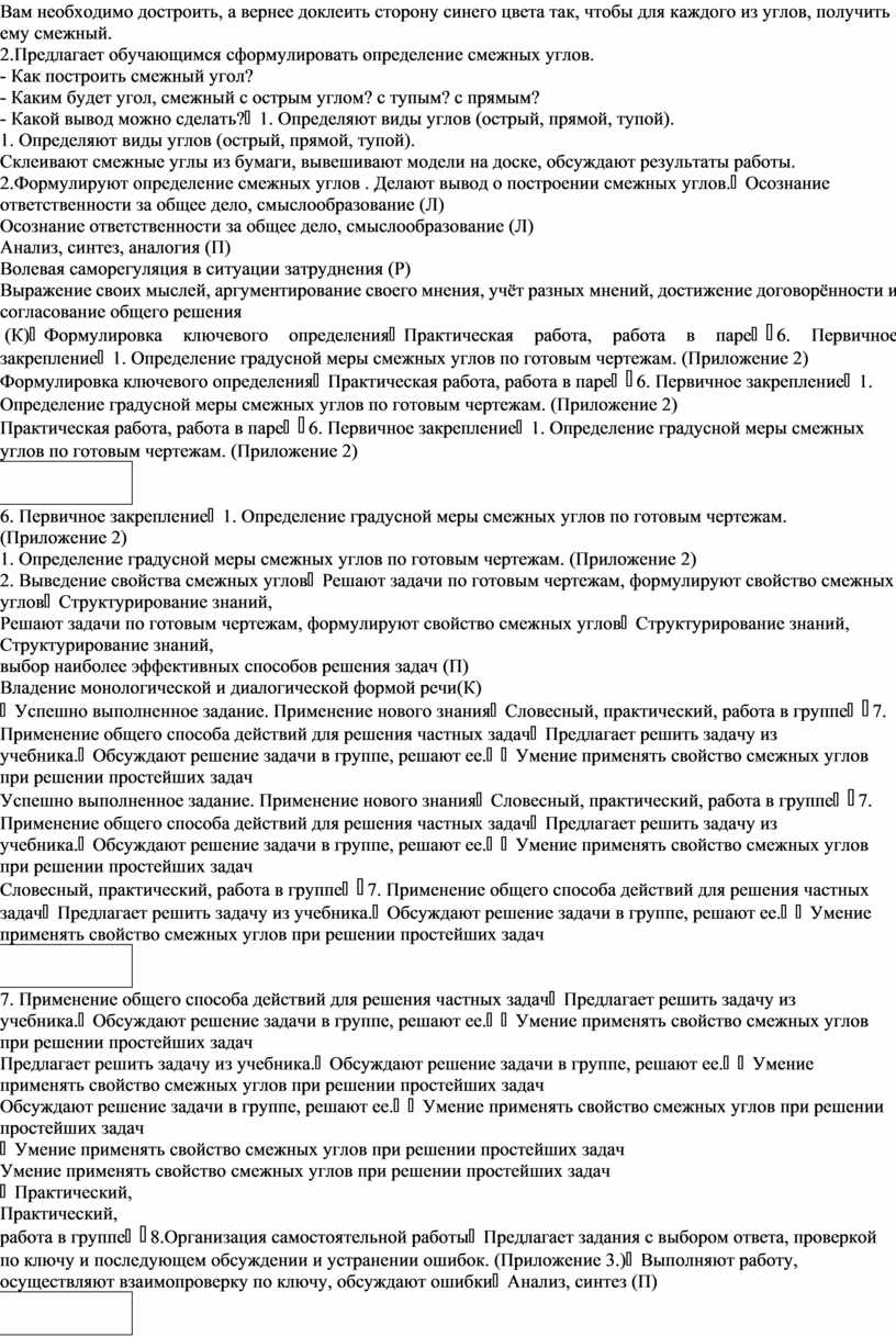 1. Определяют виды углов (острый, прямой, тупой). Склеивают смежные углы из бумаги, вывешивают модели на доске, обсуждают результаты работы. 2.Формулируют определение смежных углов . Делают вывод о построении смежных углов. |