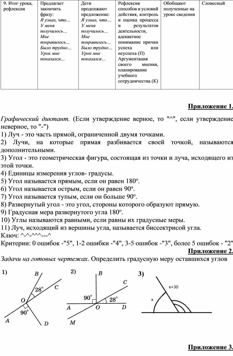 1. Определение градусной меры смежных углов по готовым чертежам. (Приложение 2) 2. Выведение свойства смежных углов |