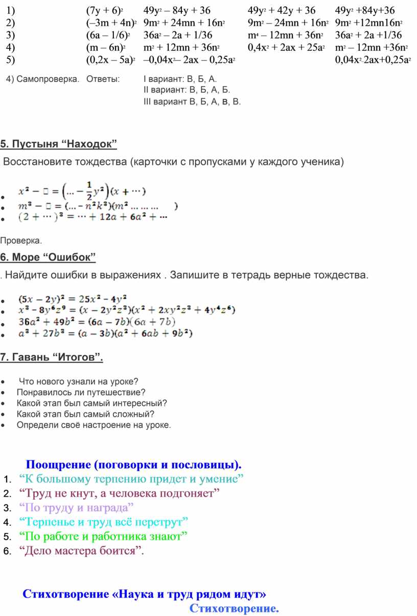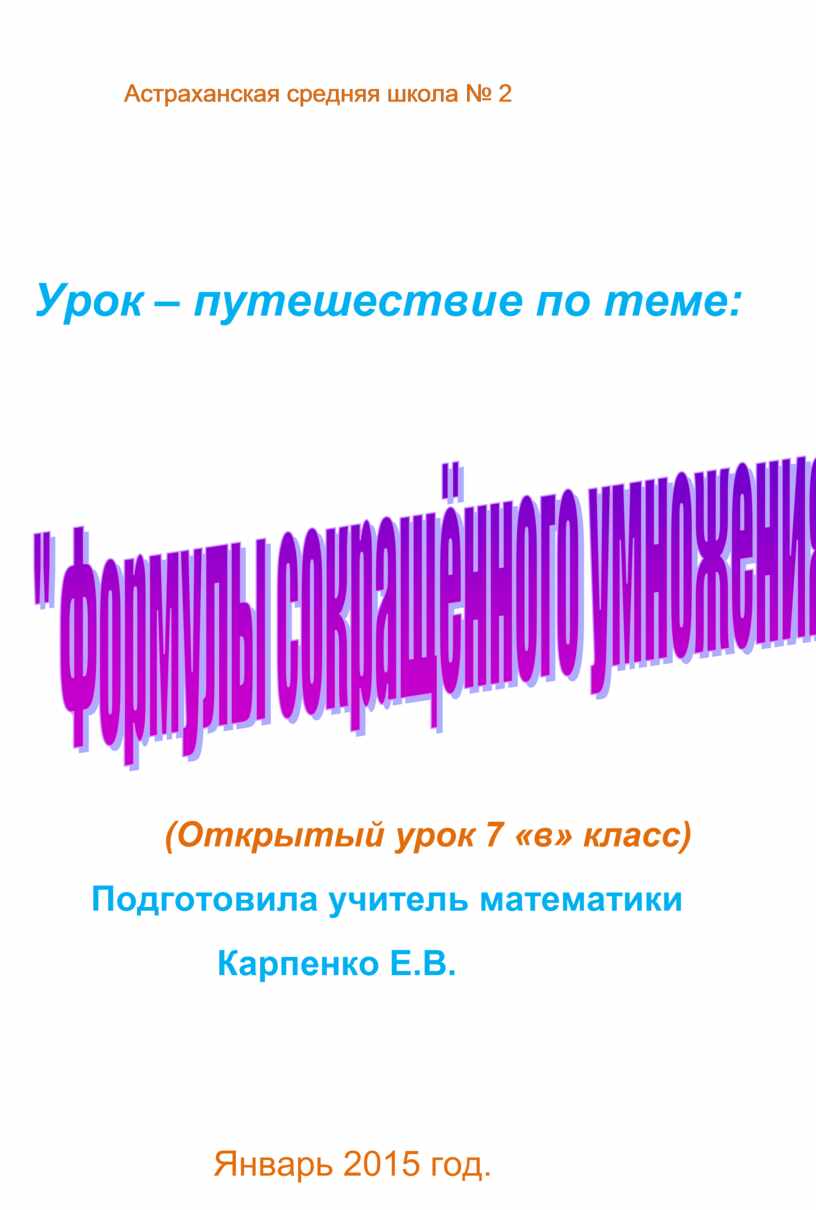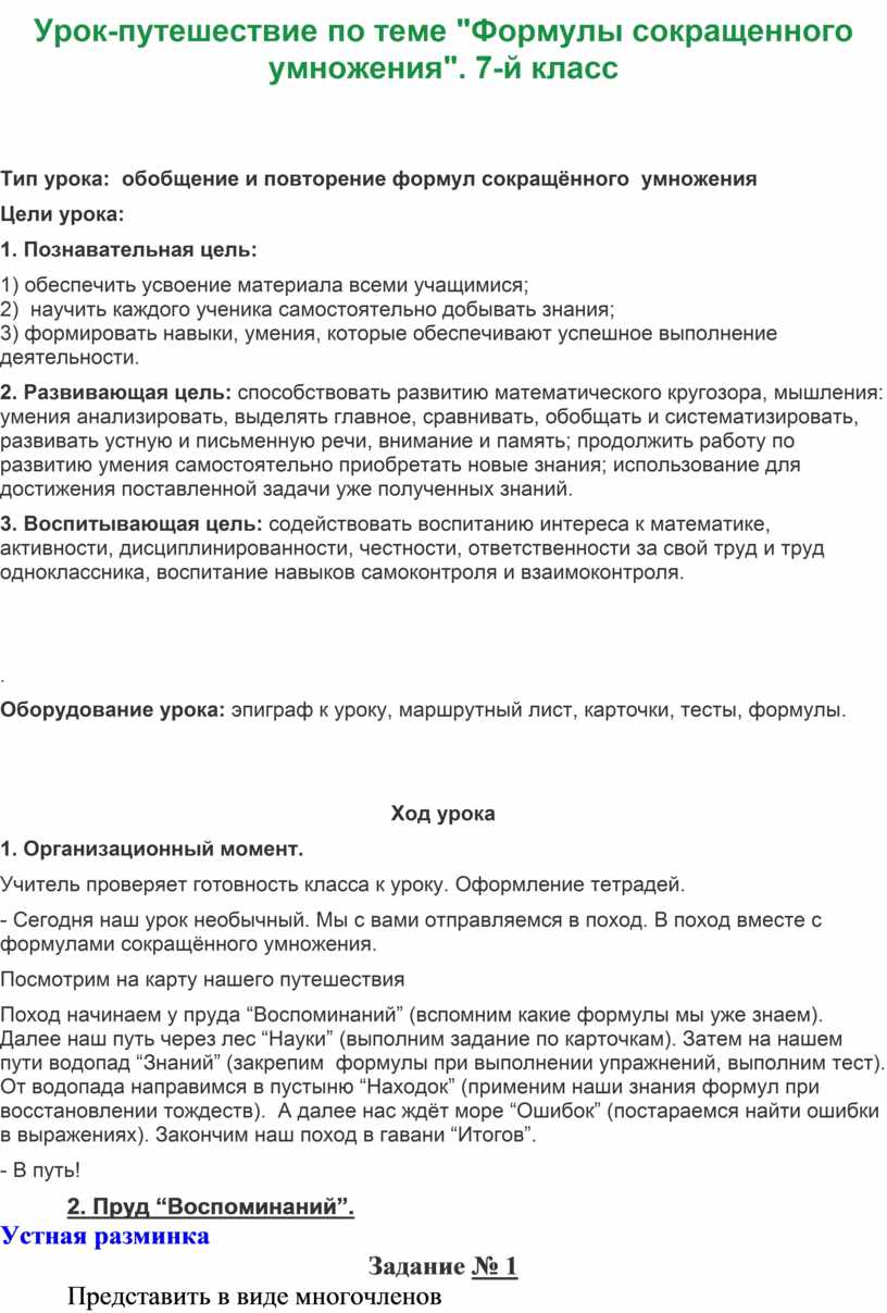 Урок-путешествие по теме "Формулы сокращенного умножения". 7-й класс