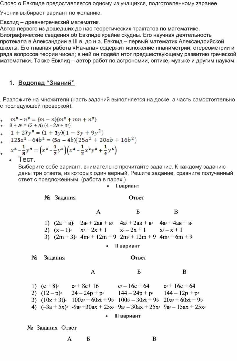 Слово о Евклиде предоставляется одному из учащихся, подготовленному заранее.